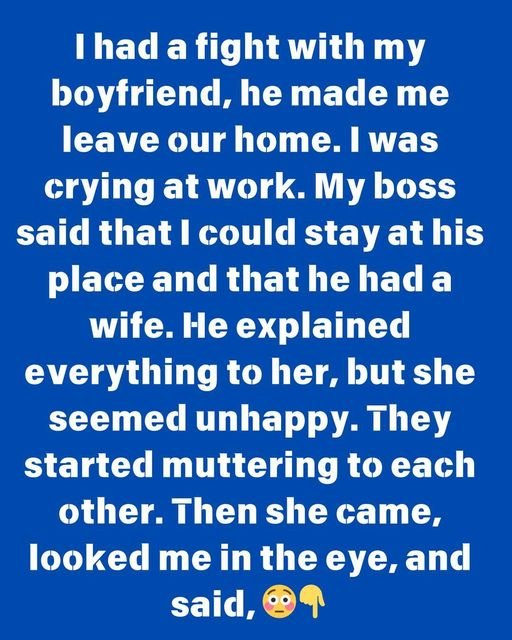 I argued with my boyfriend and he made me leave our home. I cried at work. My boss asked me to stay with him and told me he had a wife. He explained everything to her but she looked upset. They started complaining to each other. She came over, looked me in the eyes, and said “I know what you need to do.” “Get into the car.”