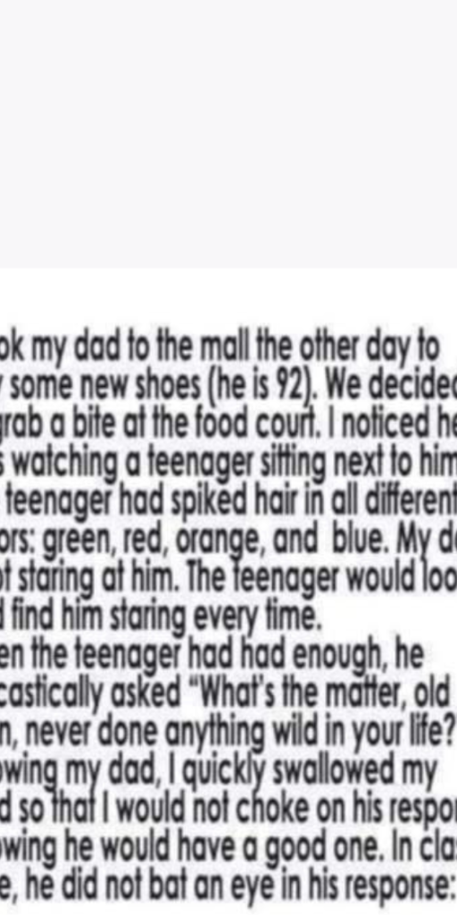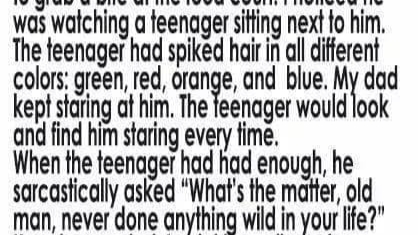 I took my 92-year-old dad to the mall recently to get him some new shoes. We stopped at the food court for a snack, and I noticed he was watching a teenager sitting nearby. The teenager had spiky hair in all kinds of colors—green, red, orange, and blue. My dad kept staring, and every time the teenager looked over, he caught my dad staring at him.