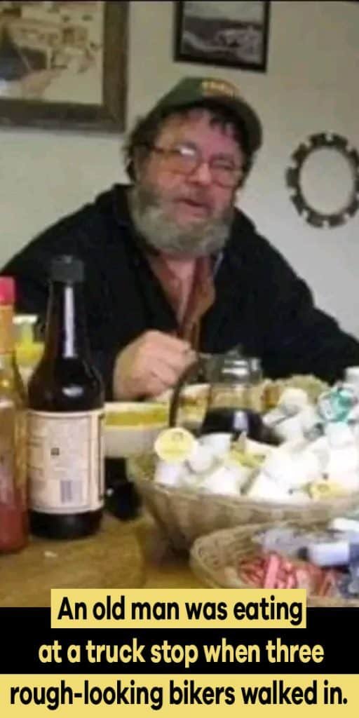An old man was eating at a truck stop when three rough-looking bikers walked in.