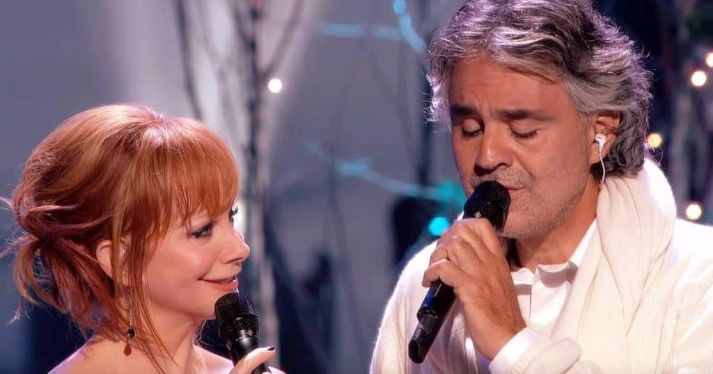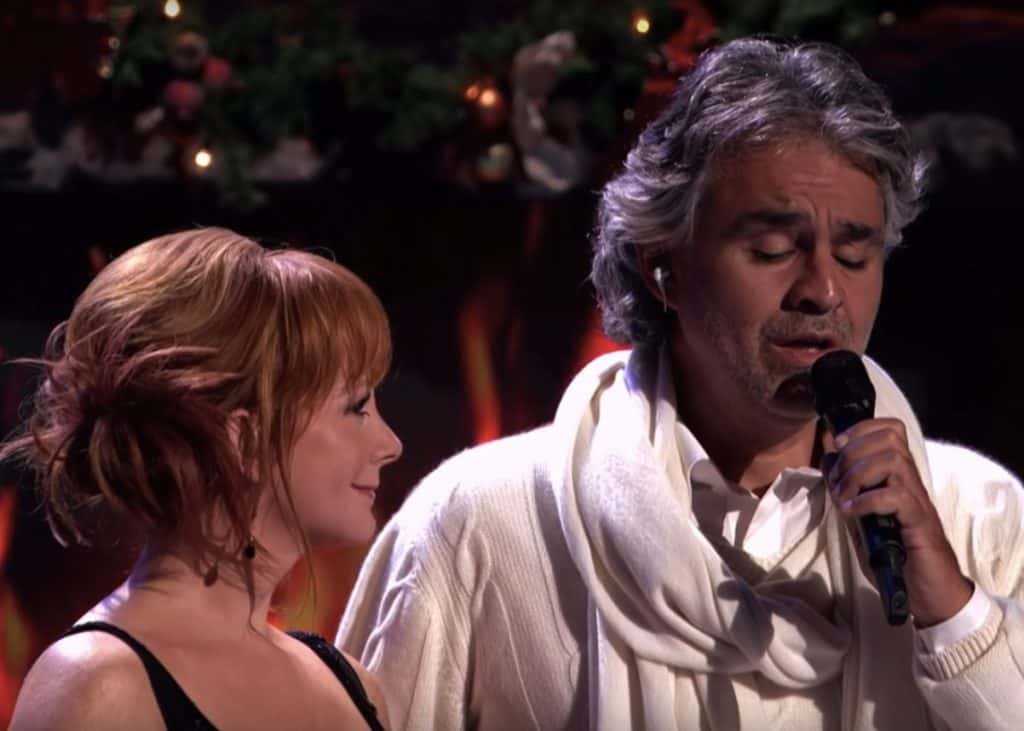 Reba joins Andrea on stage and they begin singing. Reba McEntire is a country-western star and actress who has a distinctly different style, demographic, and genre to Bocelli.