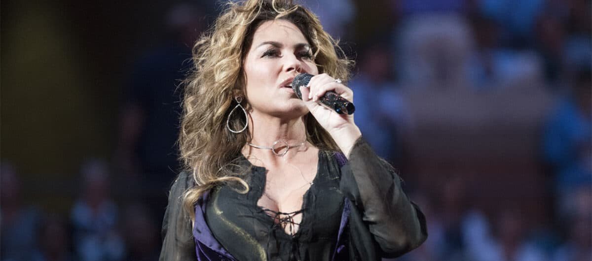 Shania Twain sings on stage.
