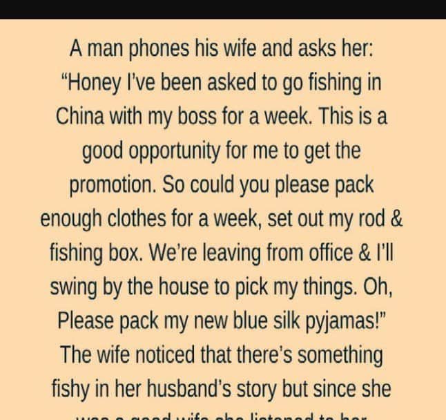 A WIFE WITH 7TH SENSE A man phones his wife and asks her: “Honey I’ve been asked to go fishing in China with my boss for a week.