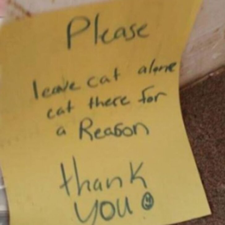 As they approached, they noticed a peculiar note beside him that read: “Please leave the cat alone cat there for a reason. Thank you.”