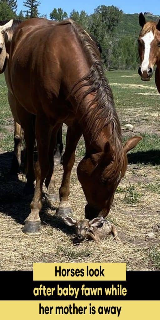 She noticed the fawn was on its own with no mother in sight, and it appeared that three horses, part of the ranch, were looking after her. The priceless photos show the horses nuzzling the tiny animal, keeping it safe.