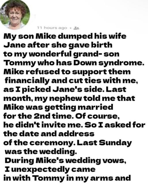 My child used to be a good spouse and father, but now he betrays his significant other and does not spend time with his children. Mike’s relationship with Tommy’s mother, Jane, fell apart after my grandson was born with Down syndrome. He then left. I discovered that he is getting married once more.