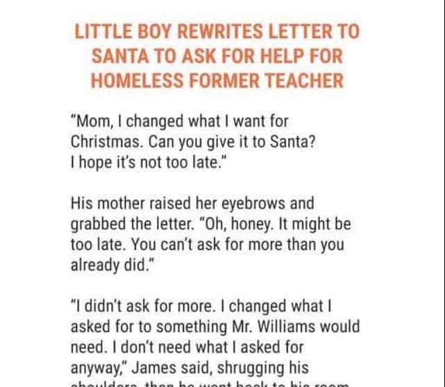 On the ride home, James learned of his teacher’s plight. Unable to shake the thought, he rewrote his Christmas wish to Santa:
