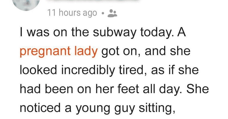A pregnant lady looking incredibly tired got on the train as if she had been on her feet all day. She obviously needed a seat, but the train was crowded.