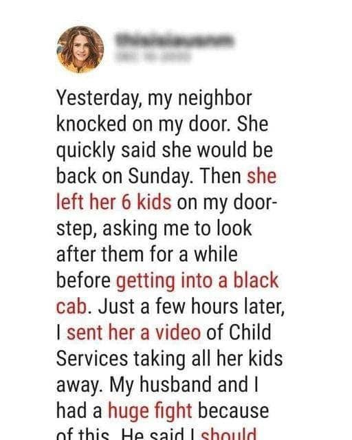 ”OP was suddenly left with the children whom she invited inside her home. Not knowing what to do, she texted the mother writing she expected her to be back in the next 40 minutes in order to pick her children up or she would be forced to call Children’s Services. When she didn’t answer the text, OP tried to call her and told her the same thing. The mother, however, said she was already out of town and she couldn’t possibly return in such a short amount of time. She also said that if OP couldn’t take care of them, she could drop them to this other neighbor, Jenifer, who was 68 years old and with a fragile health. “I repeated that if she wasn’t here in 10 she could pick them up at the local council if they decided she was a fit enough mother. She said a few bad words and told me I would never. So I did as in the moment it felt like she was baiting me. After phoning Child Services I sent her a text that it was done. She phoned me back and said she was halfway to Blackpool and that she would murder me if it was true. So I sent her a video when Child Services picked them up. The police were there too as they said they often tag along for collecting abandoned children in case something criminal has happened and they asked a lot of questions about the mother,” OP wrote.Now although OP was convinced she did the right thing, her husband, who used to be in foster care as a young child, was fuming at her because of her action. He accused her of separating the mother from her children and that she didn’t give the mother enough time to come and pick up her kids before alerting the Child Services.