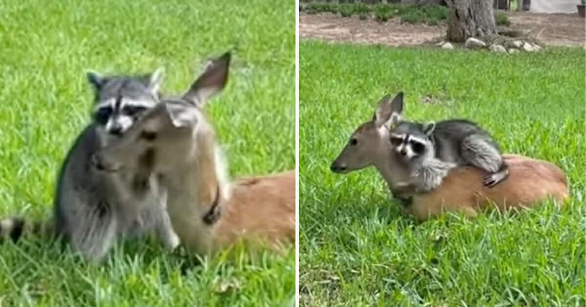 Raccoon forms sweet friendship with orphaned fawn, gives her lots of hugs