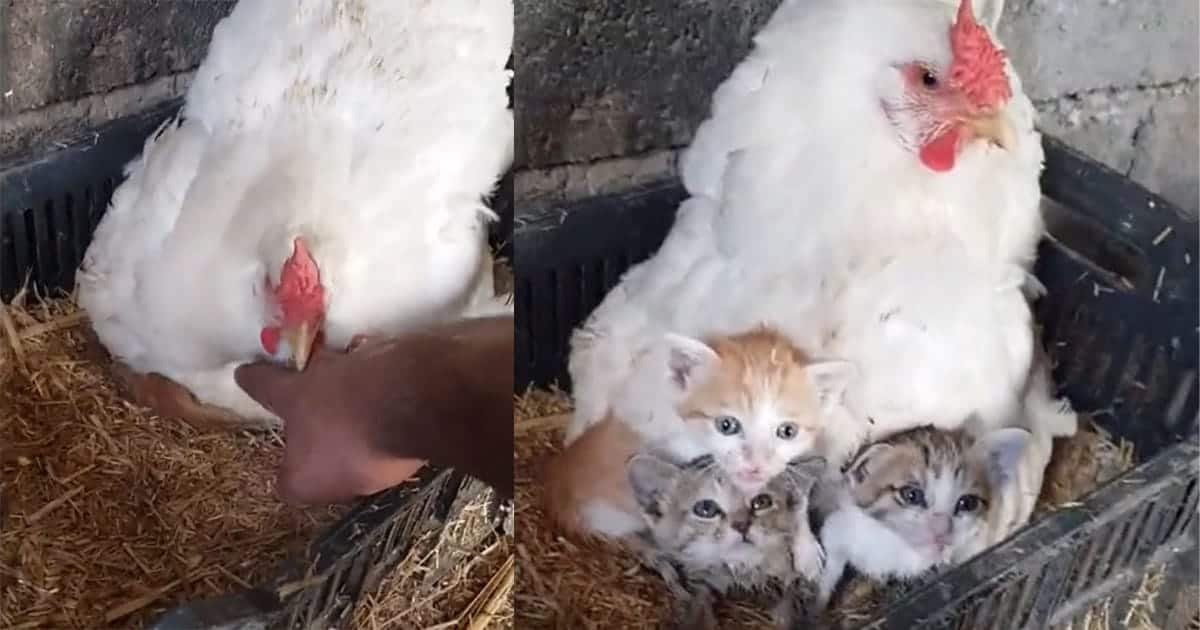Farmer is stunned to discover a chicken mothering three orphaned kittens