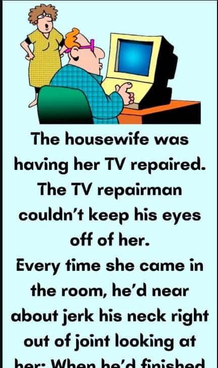 Every time she came in the room, he’d near about jerk his neck right out of joint looking at her: When he’d finished she paid him and said.