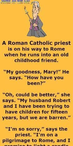 A Roman Catholic priest is on his way to Rome when he comes across an old boyhood buddy. “My goodness, Mary!” he said. “How have you been?” “Oh, could be better,” she admits. “My husband Robert and I have been trying to have children for fifteen years, but we are barren.” “I’m very sorry,” says the priest. “I’m on a pilgrimage to Rome, and I promise to light a candle for you in the great cathedral.”