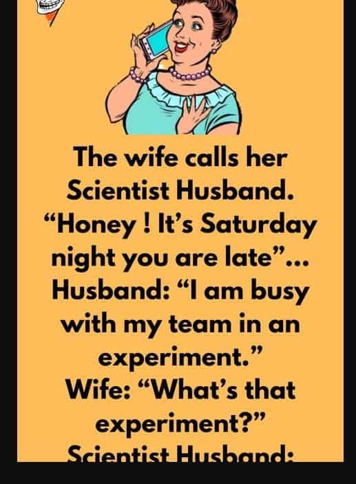 The wife calls her Scientist Husband. “Honey ! It’s Saturday night you are late”… Husband: “I am busy with my team in an experiment.